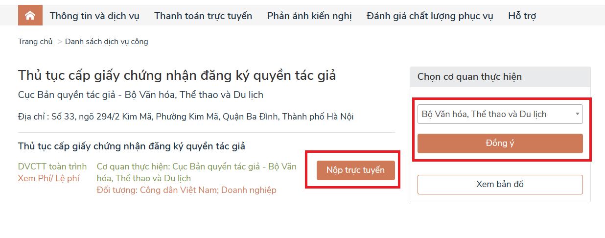 Sau khi lựa chọn thủ tục, cá nhân, tổ chức kiểm tra cơ quan thực hiện là "Bộ Văn hóa, Thể thao và Du lịch" sau đó ấn vào "Nộp trực tuyến".