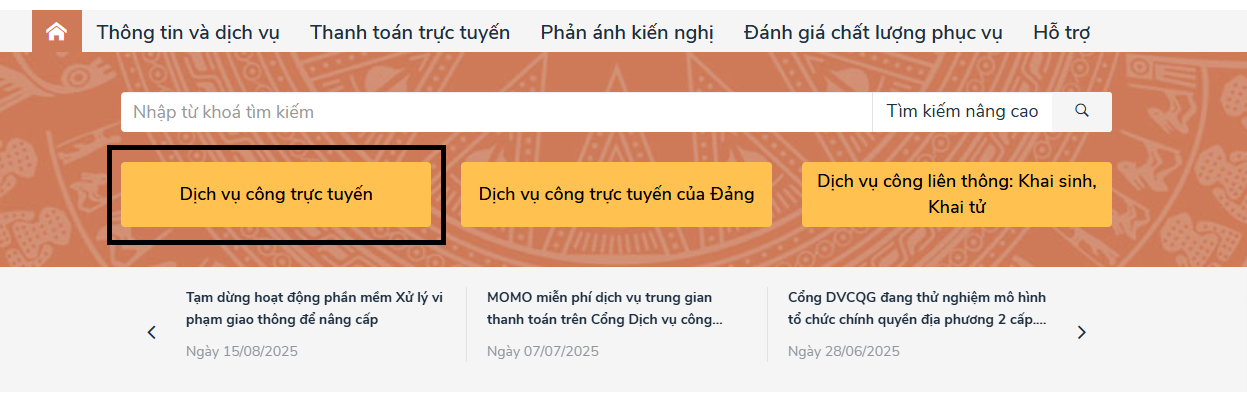 Sau khi đăng nhập, tại trang chủ của Cổng dịch vụ công quốc gia, lựa chọn "Dịch vụ công trực tuyến".